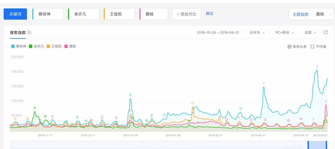 如果我把蔡徐坤、吴亦凡、鹿晗、王俊凯四位流量小生一起拉进来,情况就更明显了。2019年1月之后,从大趋势来看,吴亦凡在这四个人中间甚至长时间是垫底的。