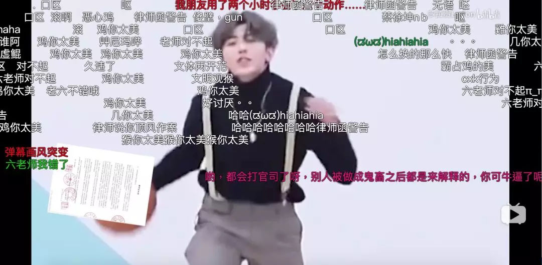 4月12日,蔡徐坤的律师函出现后,网络上反而出现了更多逆反的声音。B站上甚至出现了“你发律师函好像蔡徐坤”的新鬼畜——在这样的鬼畜中,蔡徐坤手上的篮球被换成了律师函。