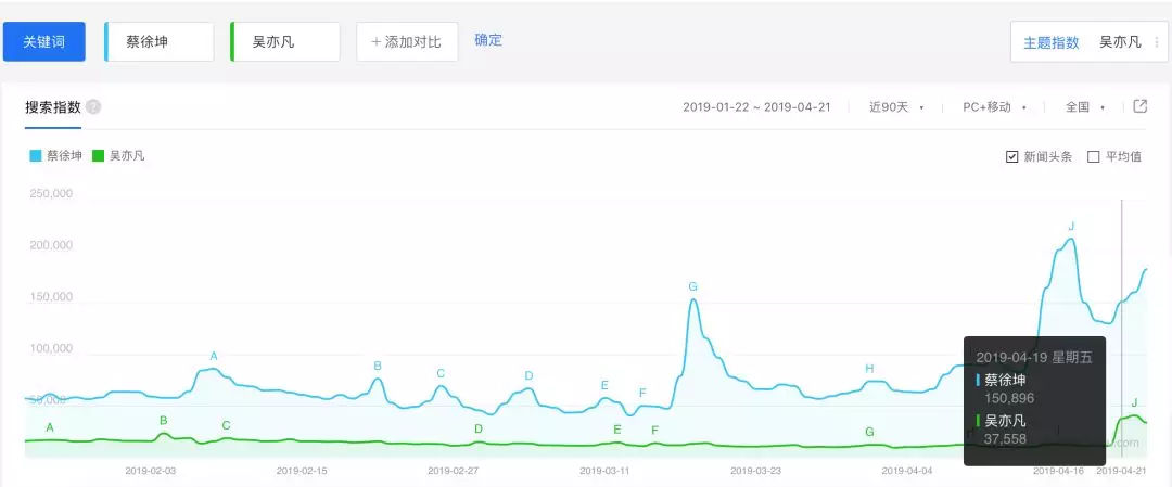 如果我们再去看吴亦凡和蔡徐坤出道以来的热度对比更能发现问题。