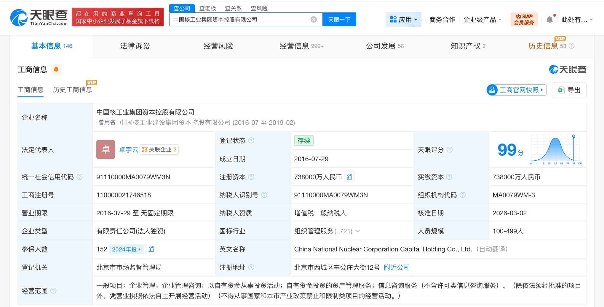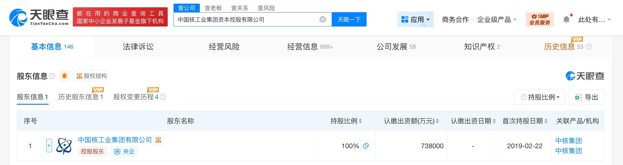 该公司成立于2016年7月,注册资本73.8亿人民币,经营范围为企业管理、企业管理咨询、以自有资金从事投资活动、自有资金投资的资产管理服务、信息咨询服务等。股东信息显示,该公司由中国核工业集团有限公司全资持股。