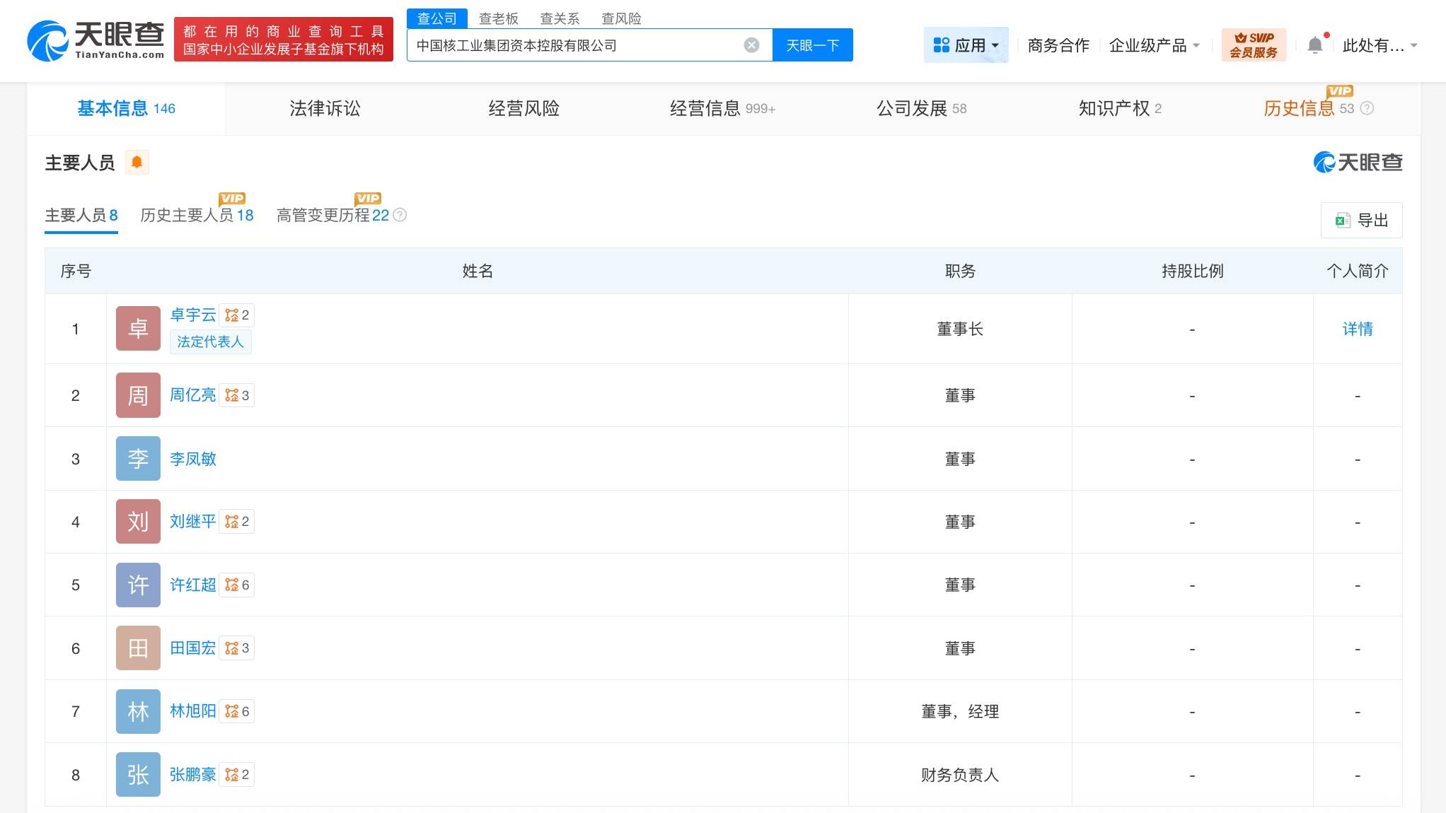 天眼查工商信息显示,近日,中国核工业集团资本控股有限公司发生工商变更,肖亚飞卸任法定代表人、董事长,由卓宇云接任,同时,多位高管发生变更。