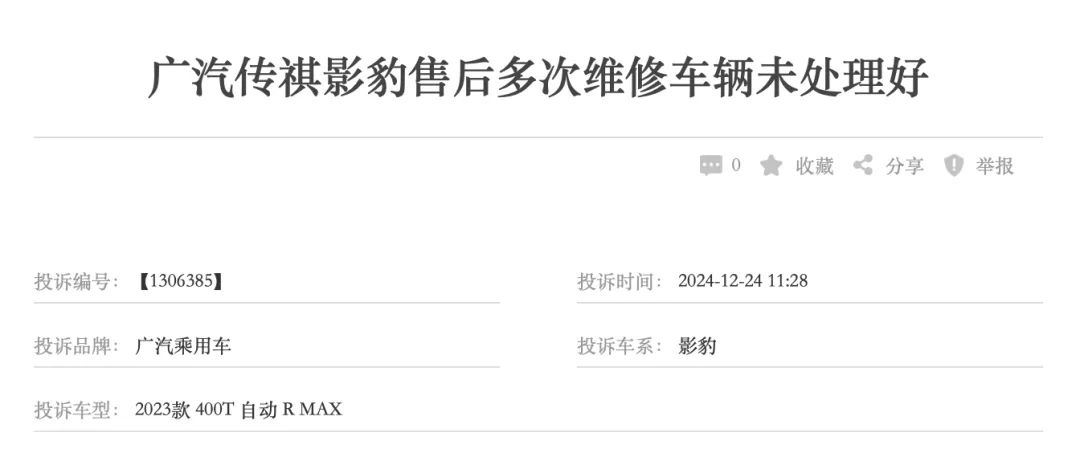 2025年10月20日,车主高先生给我们打来电话反映,2024年1月在云南文山骏驰4S店买了一辆广汽传祺影豹,目前行驶了12000公里左右。