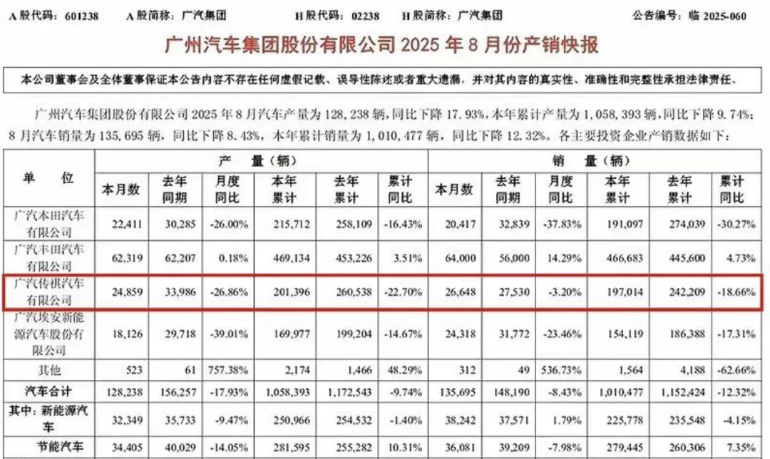 要知道,销量和口碑是并存的。数据显示,2025年8月份,广汽传祺的销量为26648辆,相比去年同期销量27530辆,同比下降3.20%。今年1-8月份,广汽传祺累计销量197014辆,相比去年同期累计销量242209辆,同比下滑18.66%,这已经是其连续第8个月下滑。