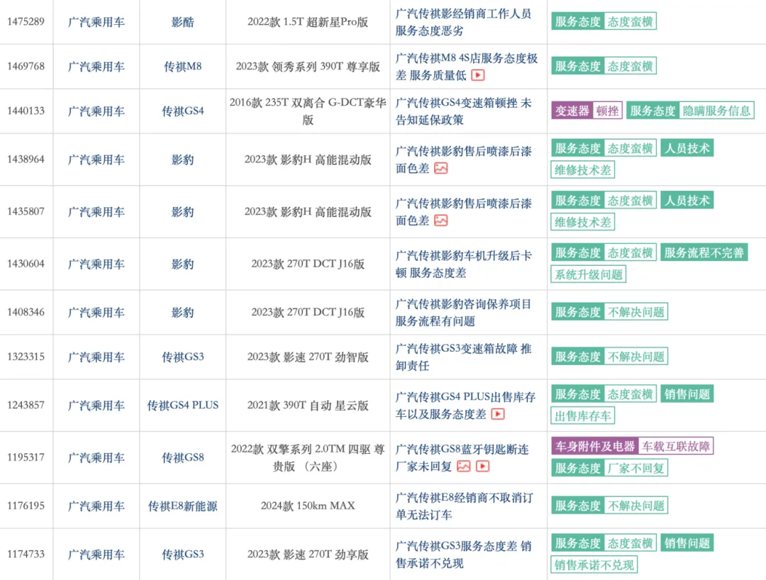 在车质网中,有广汽传祺车主反映工作人员态度差、服务流程有问题、不解决问题、承诺不兑现、厂家不回复等。