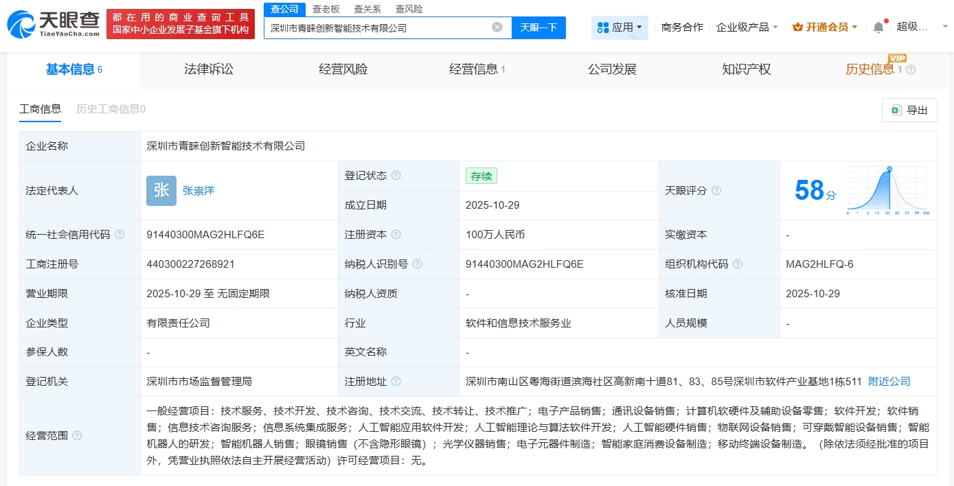 天眼查App显示,近日,深圳市青睐创新智能技术有限公司成立,法定代表人为张崇洋,注册资本100万人民币,经营范围包括信息系统集成服务、人工智能应用软件开发、人工智能理论与算法软件开发等。