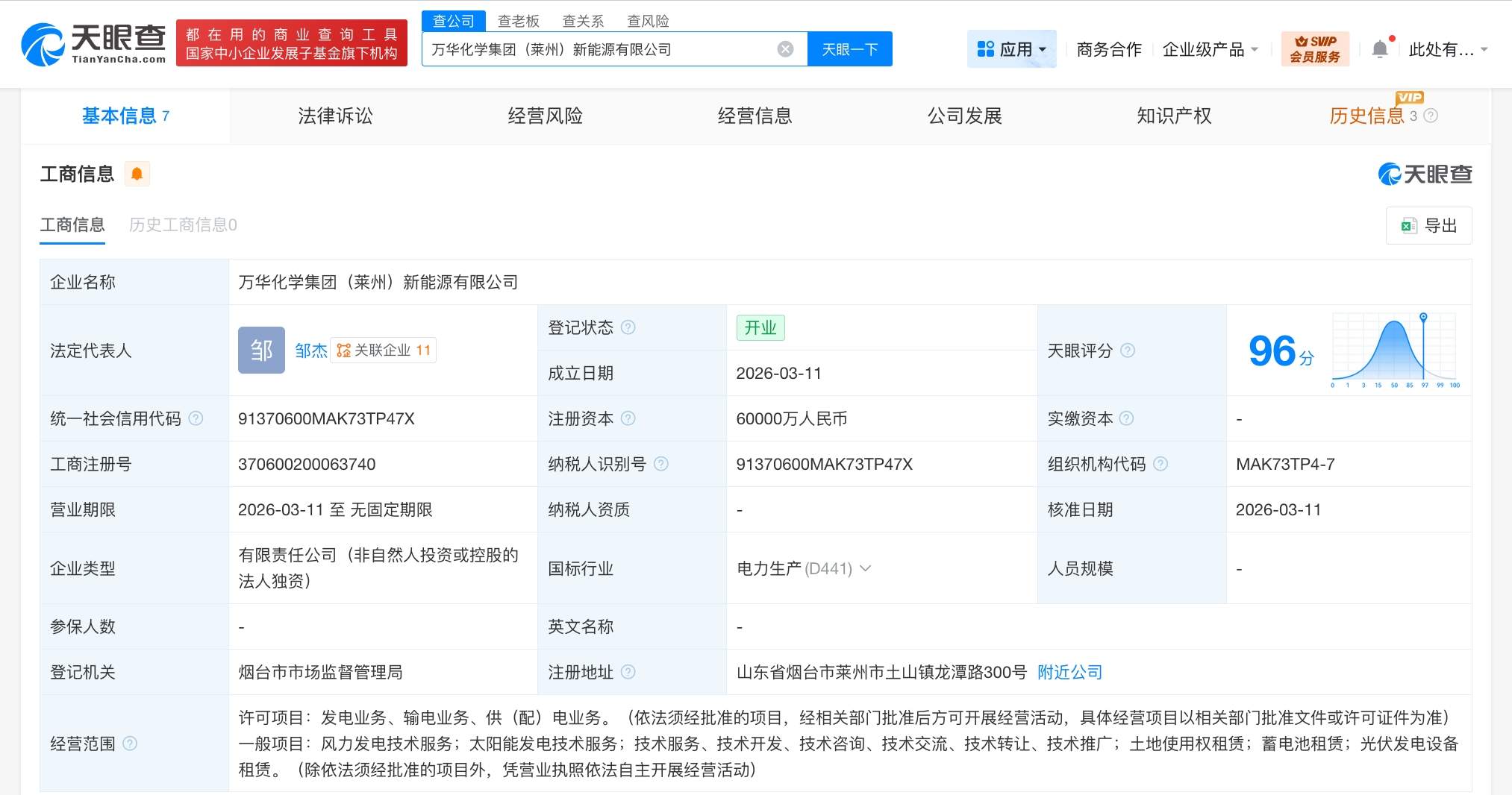 天眼查工商信息显示,近日,万华化学集团(莱州)新能源有限公司成立,法定代表人为邹杰,注册资本6亿人民币,经营范围包括发电业务、输电业务、供(配)电业务、风力发电技术服务、太阳能发电技术服务、蓄电池租赁、光伏发电设备租赁等。