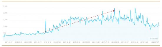 根据百度指数显示,2014年开始,电动牙刷的搜索热度逐渐攀升,并在往后几年呈现持续上升态势,一直到近两年才趋于稳定。