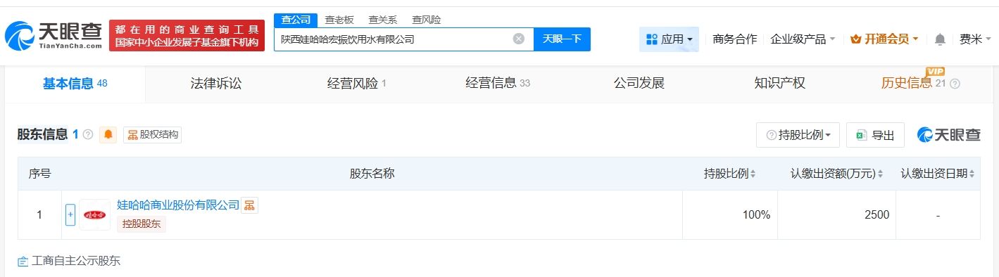 陕西娃哈哈宏振饮用水有限公司成立于2015年2月,法定代表人为盛文龙,注册资本2500万人民币,经营范围为饮料、食品用塑料包装容器生产、销售。股东信息显示,该公司由娃哈哈商业股份有限公司全资持股。