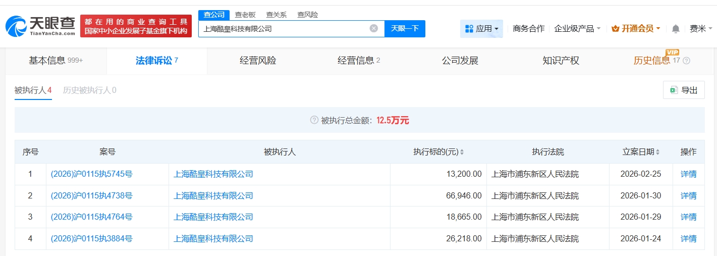 上海酷皇科技有限公司成立于2021年5月,法定代表人为杨西初,注册资本1000万美元,经营范围包括网络技术服务、互联网销售、广告制作等,由Lurenwang Limited全资持股。法律诉讼信息显示,今年以来,该公司已被多次执行。