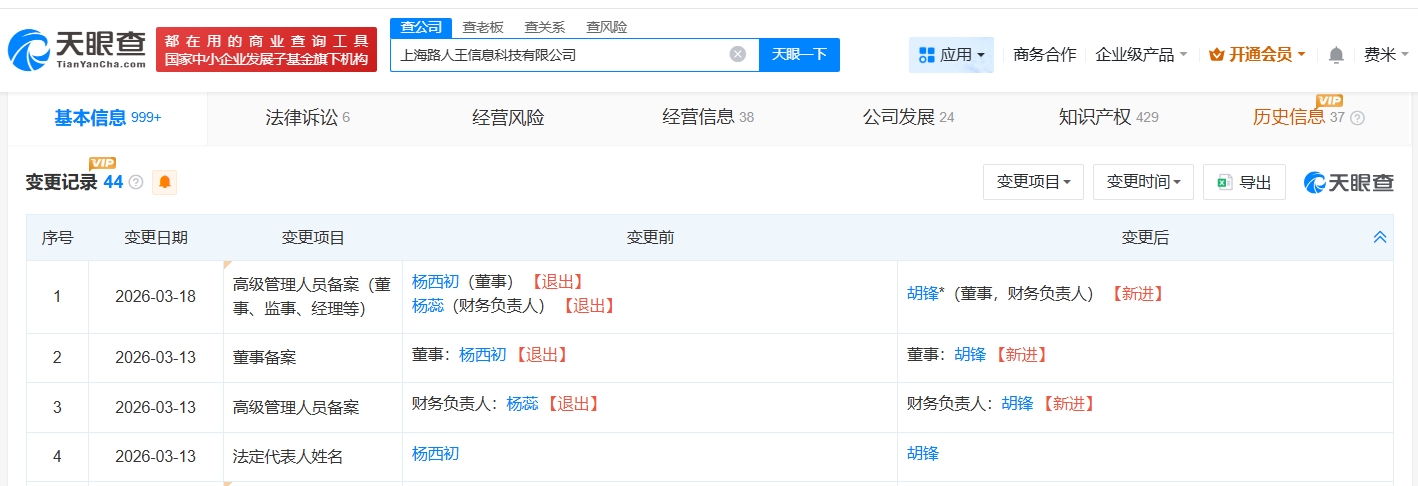 天眼查App显示,“路人王”关联公司上海路人王信息科技有限公司成立于2019年9月,注册资本1000万人民币,经营范围包括组织体育表演活动、体育经纪人服务、体育竞赛组织等,由程杭、上海花华圆园文化传播集团股份有限公司共同持股。变更记录显示,近期,杨西初卸任该公司法定代表人、董事,由胡锋接任。