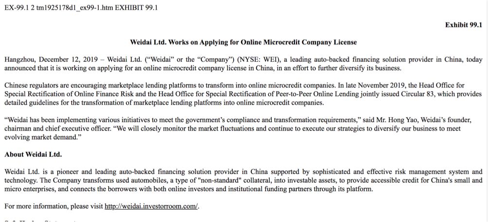 据此前微贷网SEC公告显示,目前微贷网已经正式申请互联网小贷牌照,为企业的下一步深度转型做合规准备。而51信用卡也于12月6日发布公告,称其正在积极申请“83号文件”所述的互联网小贷牌照,以谋求互金企业可持续发展的长期目标。