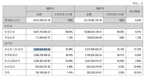 实际上,在2022年及2023年,除西式电器系列之外,公司其余三大系列全线下滑。以2023年为例,食品加工机系列实现营收29.4亿元,同比下滑10.18%;营养煲系列实现营收36.97亿元,同比下滑0.24%;炊具实现营收4.21亿元,同比下滑33.66%。