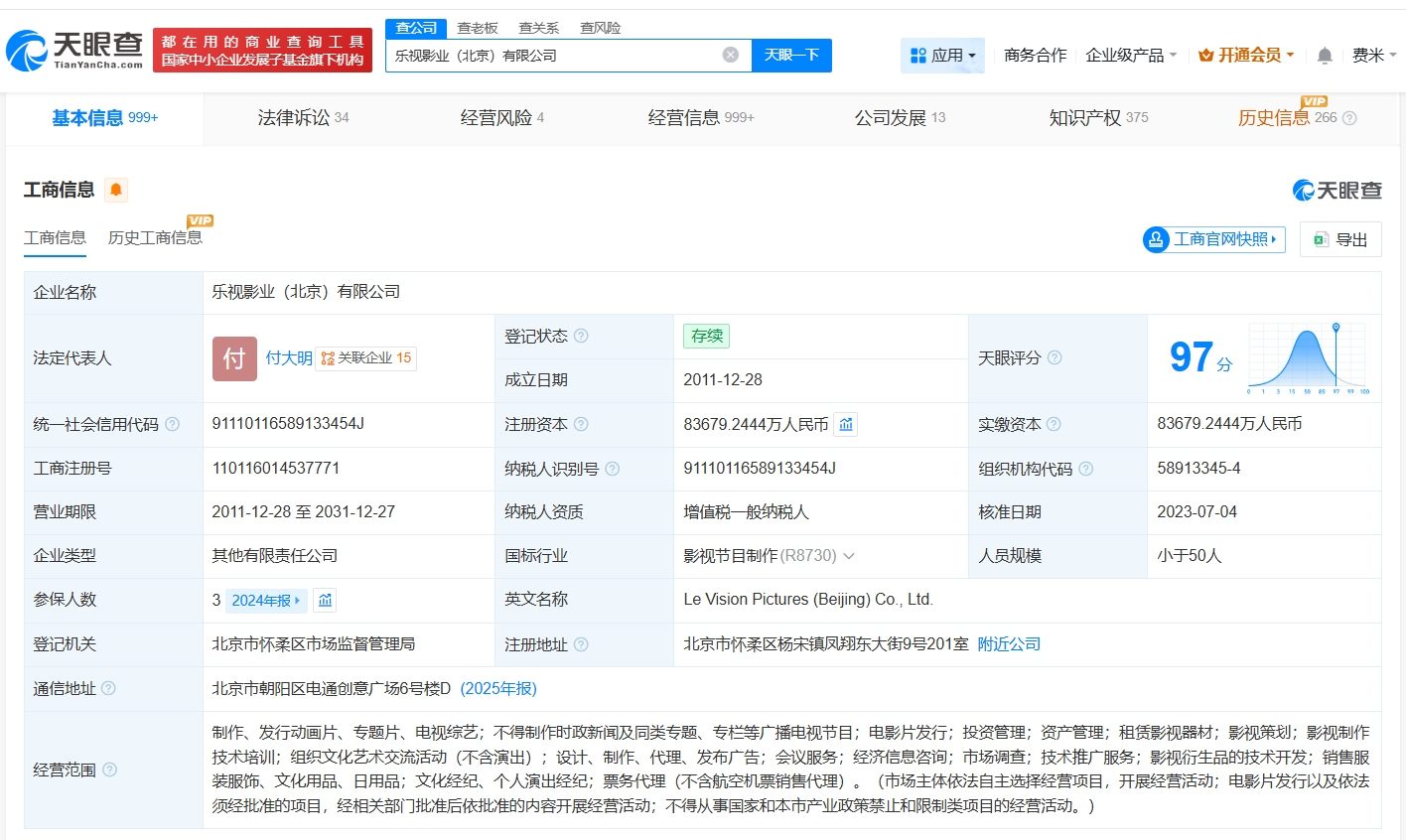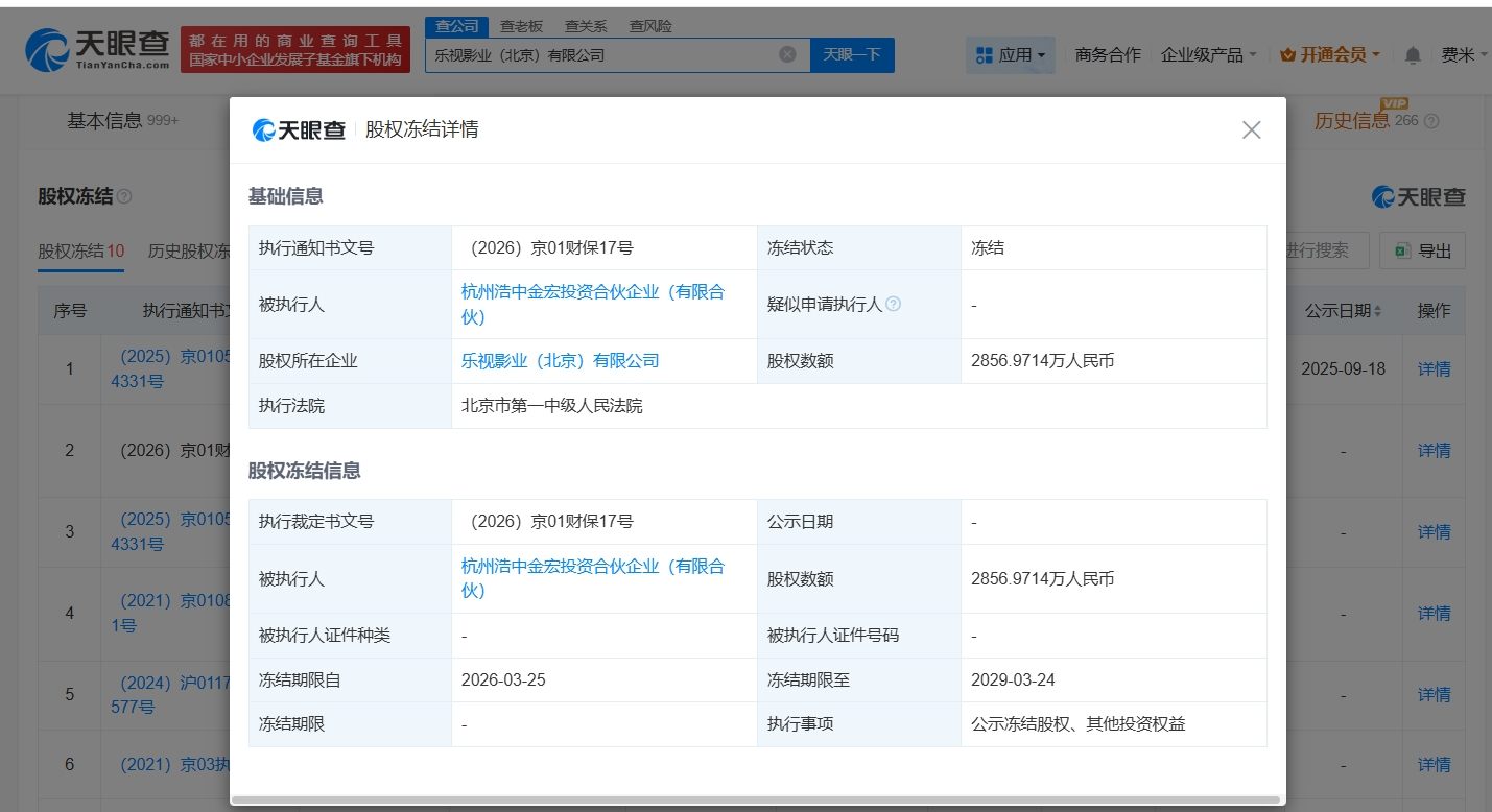 天眼查法律诉讼信息显示,近日,乐视影业(北京)有限公司新增一则股权冻结信息,被执行人为杭州浩中金宏投资合伙企业(有限合伙),冻结股权数额2856万余元,执行法院为北京市第一中级人民法院。