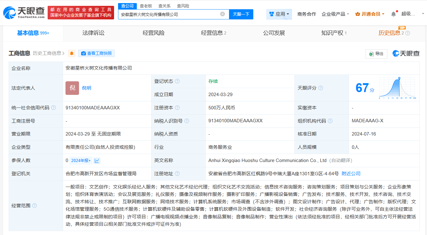 天眼查App显示,星辰之乔账号关联公司安徽星桥火树文化传播有限公司成立于2024年3月,法定代表人为倪明,注册资本500万人民币,经营范围包括文艺创作、文化娱乐经纪人服务、其他文化艺术经纪代理、组织文化艺术交流活动等,由倪明、肖杰共同持股。知识产权信息显示,今年1月,该公司已登记旺仔小乔美术作品著作权。年报信息显示,该公司2024年参保人数为0。