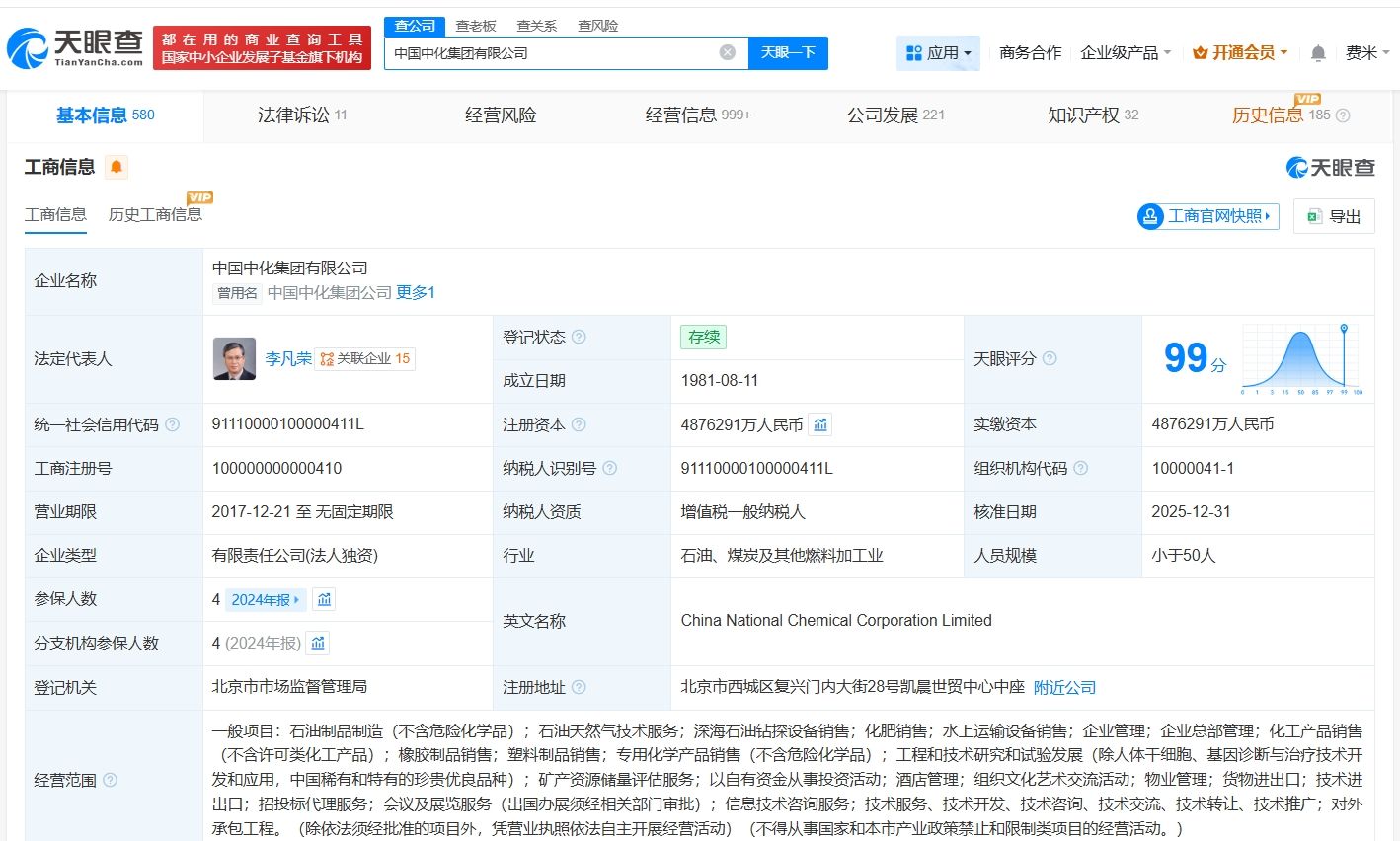 中国中化集团有限公司成立于1981年8月,法定代表人为李凡荣,经营范围包括石油天然气技术服务、深海石油钻探设备销售、化肥销售等。股东信息显示,该公司由中国中化控股有限责任公司全资持股。