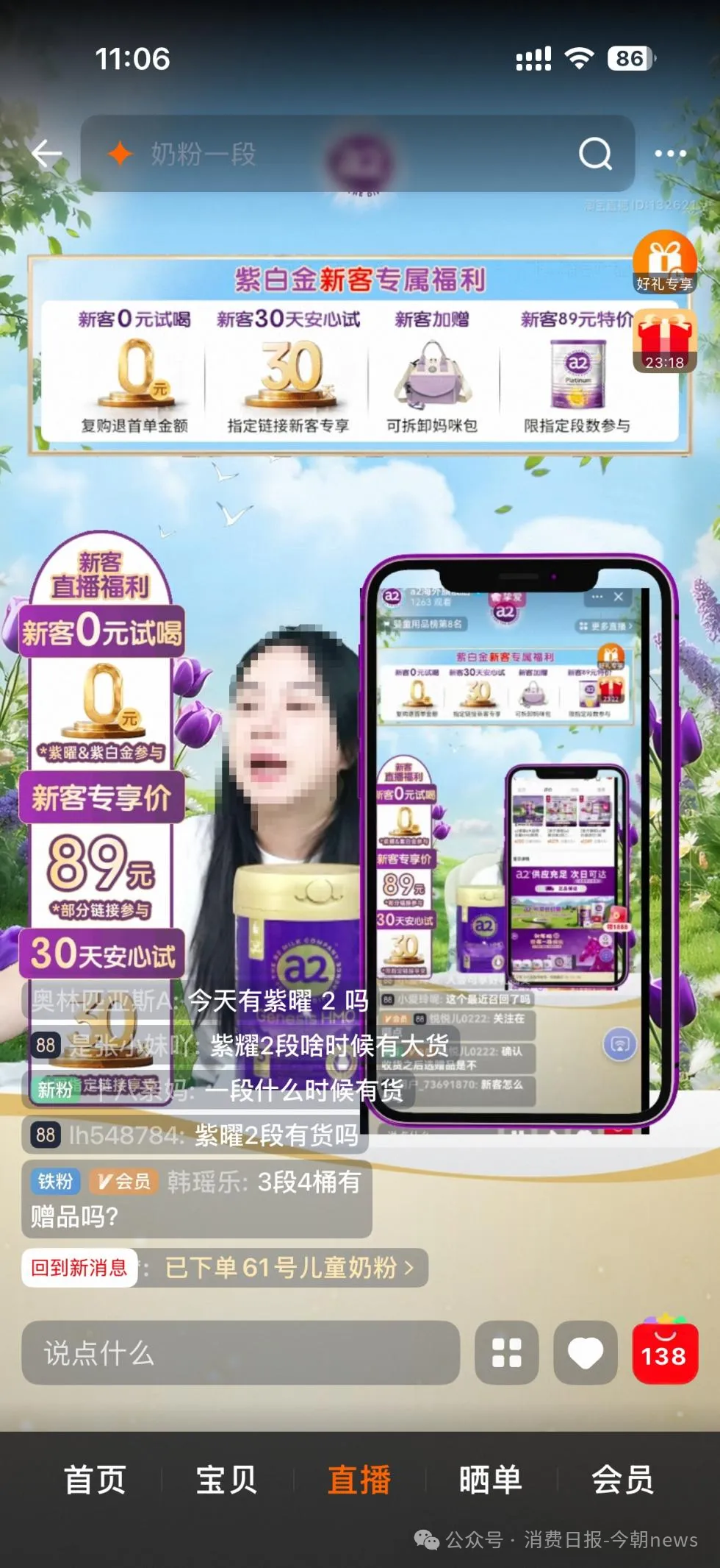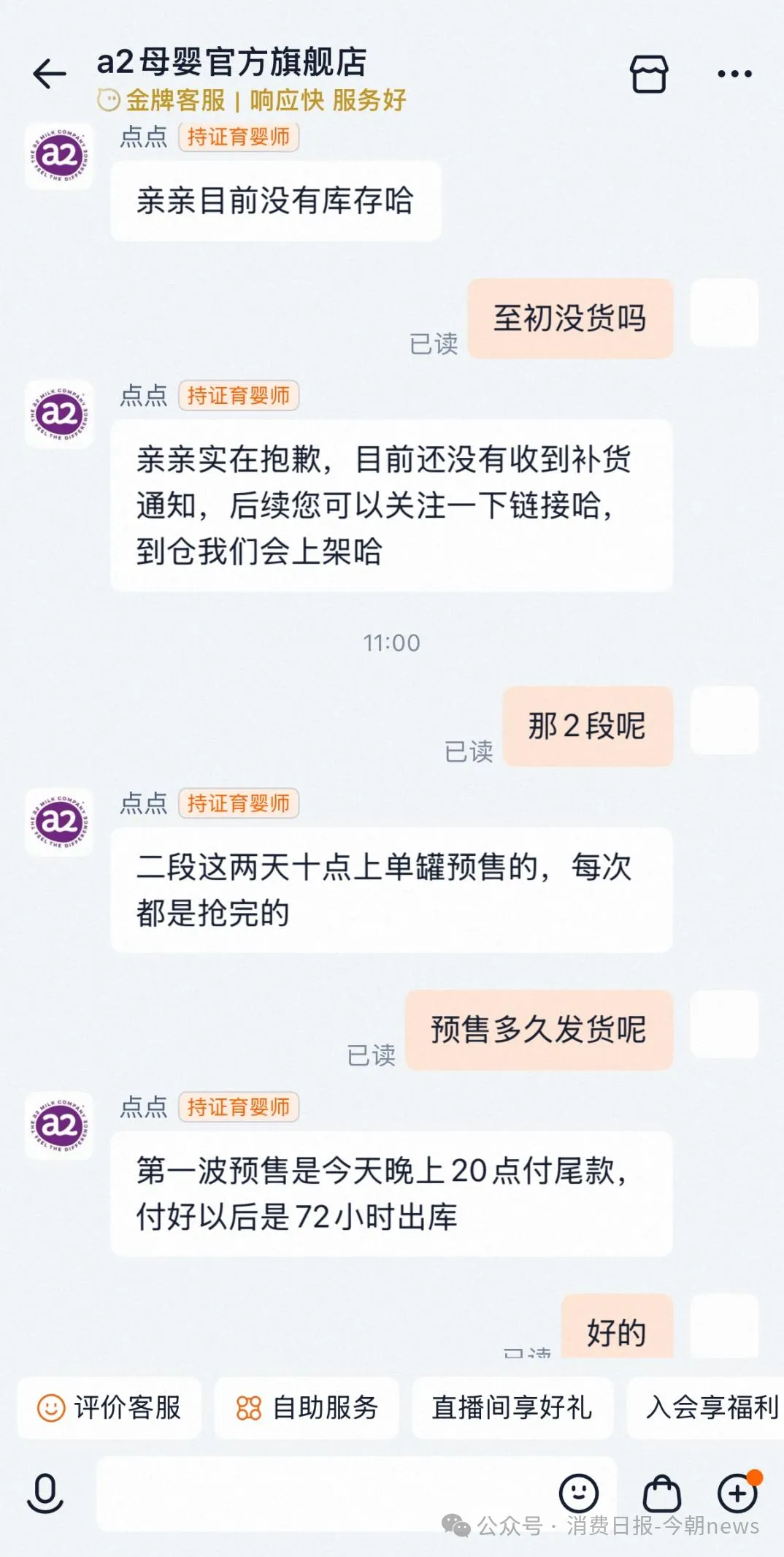 而在a2海外旗舰店中,英文标签a2 Platinum紫白金款目前1段、2段、3段均显示有货,并标注有“供应充足 次日可达”字样,只是其2025年初刚推出的高端新品a2紫曜™目前1段、2段同样处于缺货状态,同时,品牌直播间中不断有消费者询问这两款产品何时到货。