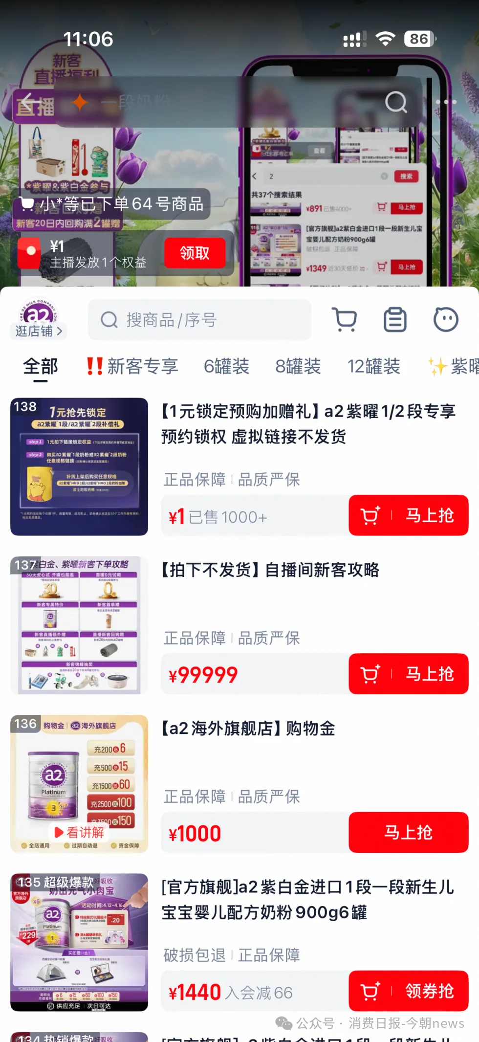 为此,该店直播间还特意推出“1元抢先锁定a2紫曜™1段、a2紫曜™2段补偿礼”活动,即购买此链接用户可在该店a2紫曜™HMO1段、a2紫曜™HMO2段奶粉补货上架后购买任意规格可获得该补偿礼品。