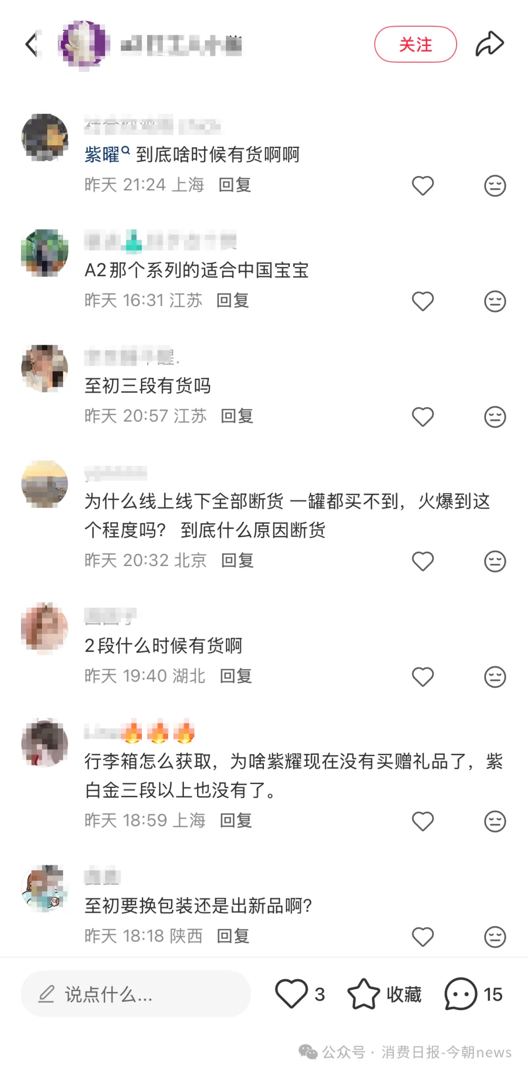 在小红书平台,《今朝新闻》发现,有地址显示为北京、湖北、江苏、上海、浙江、广东等IP地址的网友也在询问a2公司的产品缺货问题,询问产品涉及上述中文标签1段、2段产品以及a2紫曜™1段、2段产品,可见此次断货影响范围之广。