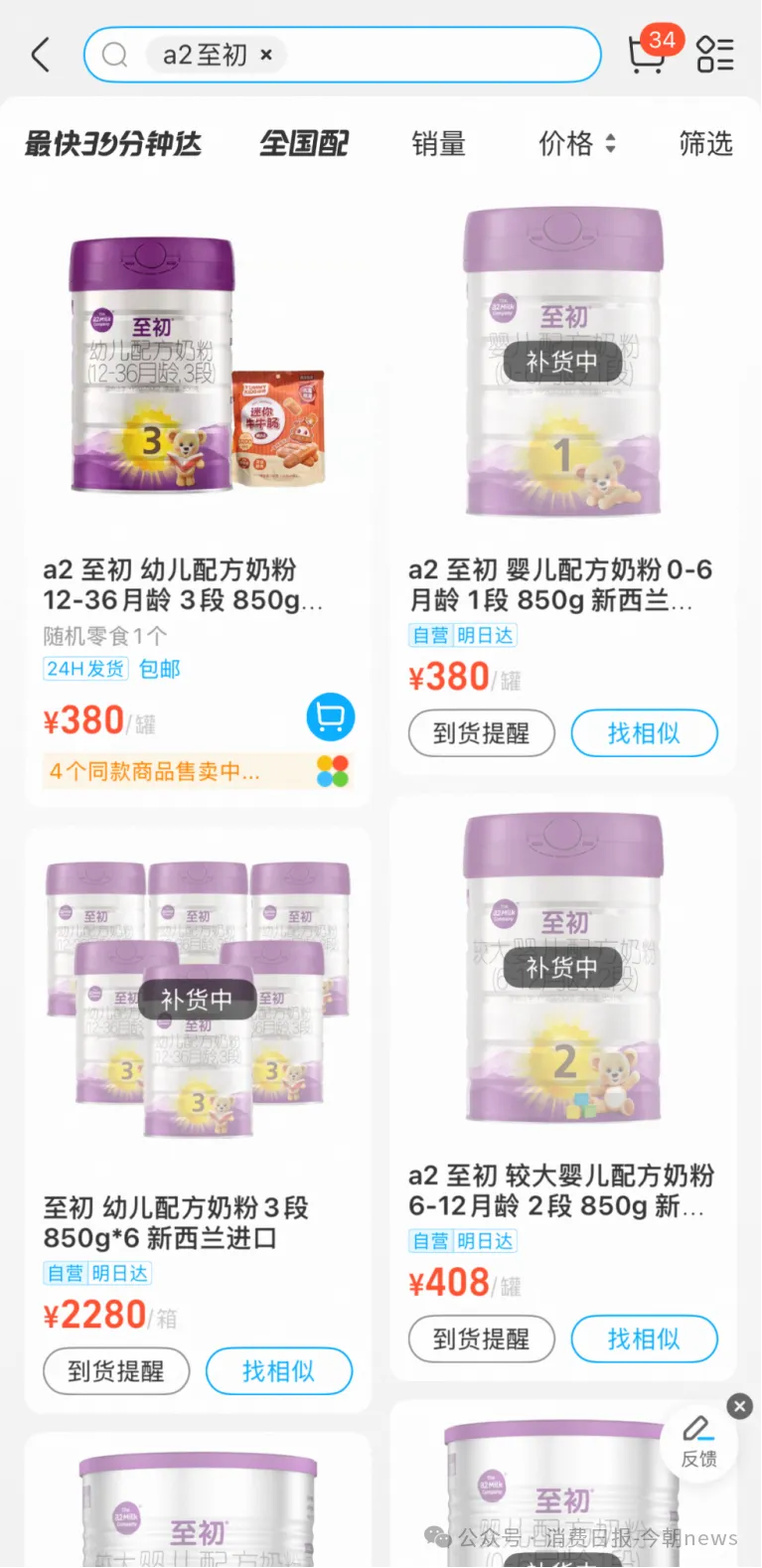 记者在淘宝a2母婴官方旗舰店看到,目前a2至初1段、2段,以及4段儿童调制乳粉处于缺货状态,记者以消费者身份询问旗舰店客服产品情况,其客服确认,1段目前没有库存,2段则实行限量预售,这两天十点会上单罐预售,付款后72小时出库。京东a2至初母婴旗舰店同样显示1段、2段,以及4段儿童调制乳粉处于缺货状态,只有3段产品在正常销售。
