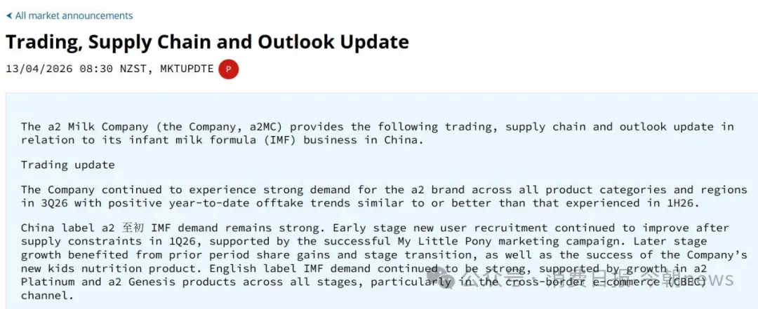 4月13日,新西兰a2牛奶公司(The a2 Milk Company Limited,下称“a2公司”)发布自愿性公告,其中文标签婴配粉预计2026年4-5月出现阶段性供应紧张,并同步下调2026财年业绩预期。