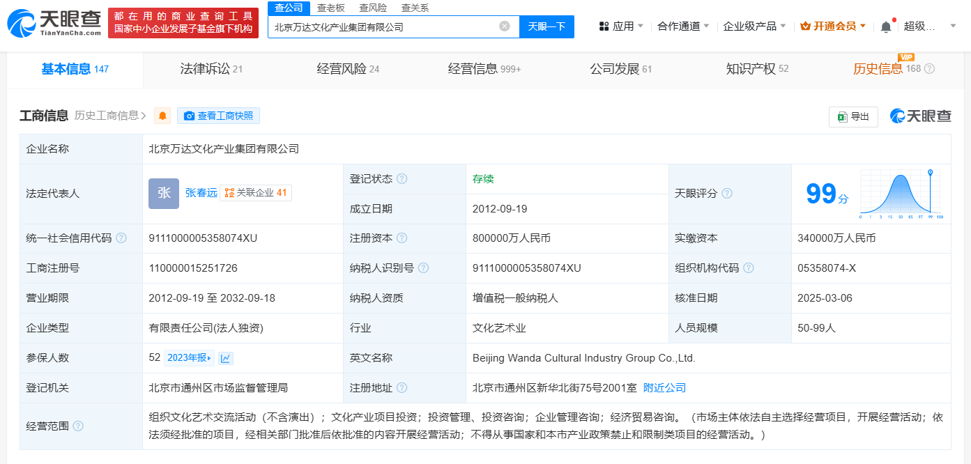 天眼查深度风险信息显示,近日,北京万达文化产业集团有限公司新增1条股权冻结信息,被执行人为大连万达集团股份有限公司,冻结股权数额80亿人民币,冻结期限自2025年3月18日至2028年3月17日,执行法院为河南省郑州市中级人民法院。