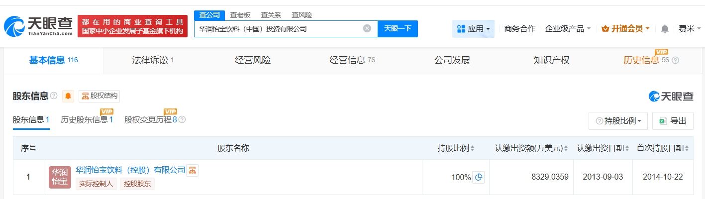 华润怡宝饮料(中国)投资有限公司成立于2011年8月,法定代表人为张伟通,经营范围包括在国家允许外商投资的食品饮料领域依法进行投资、从事货物及技术进出口等。股东信息显示,该公司由华润怡宝饮料(控股)有限公司全资持股。