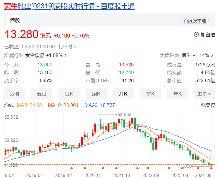 公开数据显示,蒙牛的市值从2021年初达到近2000亿元的巅峰后便开始一路下滑,时至今日公司市值刚过520亿,相较于巅峰时期跌幅超70%。