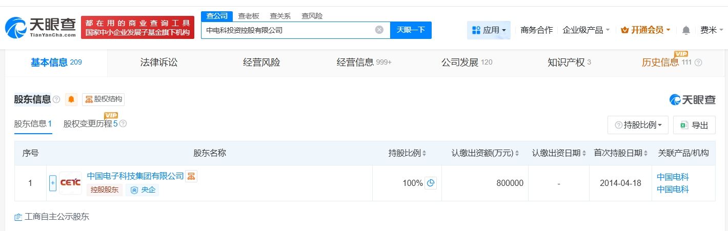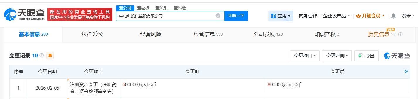 天眼查App显示,近日,中电科投资控股有限公司发生工商变更,注册资本由50亿人民币增至80亿人民币,增幅60%。