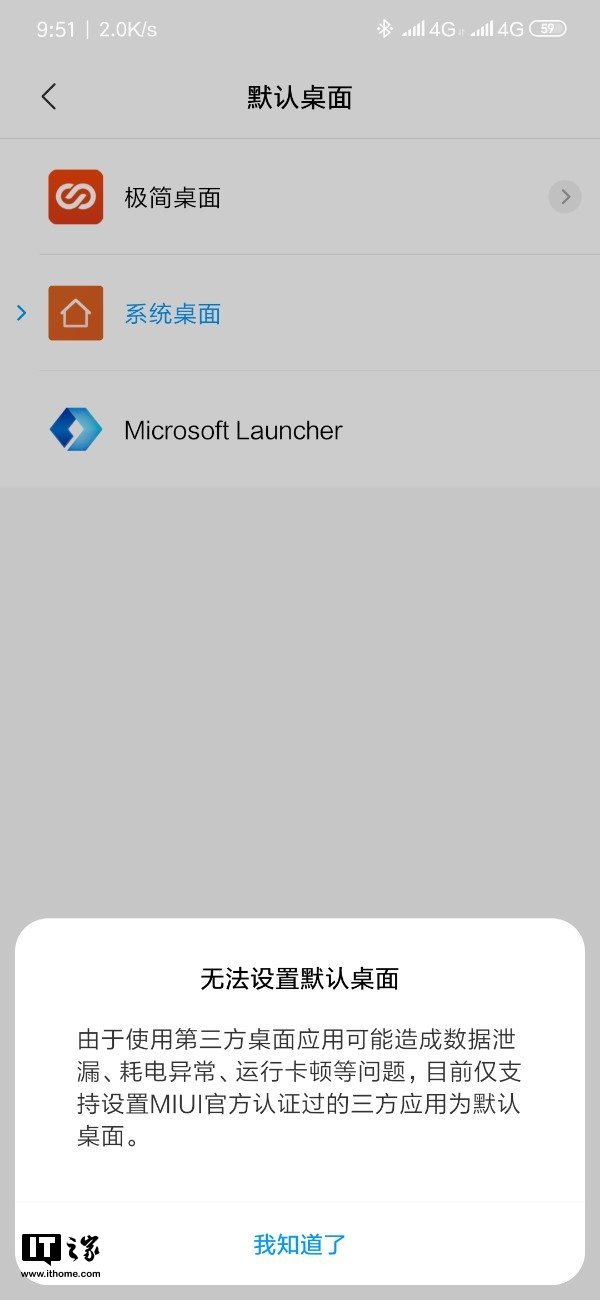 IT之家4月2日消息 在近期的小米9最新MIUI 10开发版更新中,在默认桌面方面升级了新的设置功能,根据小米MIUI开发版提示,由于第三方桌面应用可能造成数据泄露、耗电异常、运行卡顿等问题,目前仅支持设置MIUI官方认证国的三方应用为默认桌面。