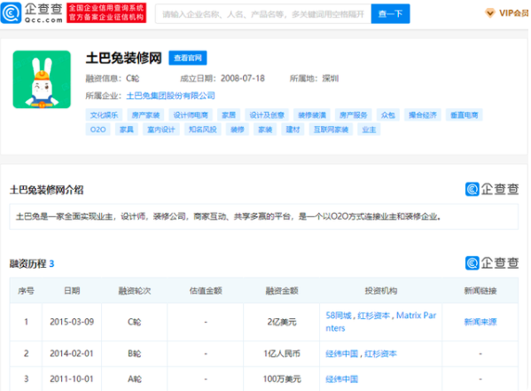 资料显示,土巴兔创始人兼CEO王国彬在2008年创立了土巴兔,致力于解决传统家装过程中的痛点。截至2020年12月31日,土巴兔的业务已覆盖300多座城市,平台已累计入驻11万多家家装企业。企查查APP显示,土巴兔是一家全面实现业主,设计师,装修公司,商家互动、共享多赢的平台,是一个以O2O方式连接业主和装修企业。信息显示,土巴兔至今共有3次融资记录,投资机构包括58同城、红杉资本、Matrix Parnters、经纬中国等。