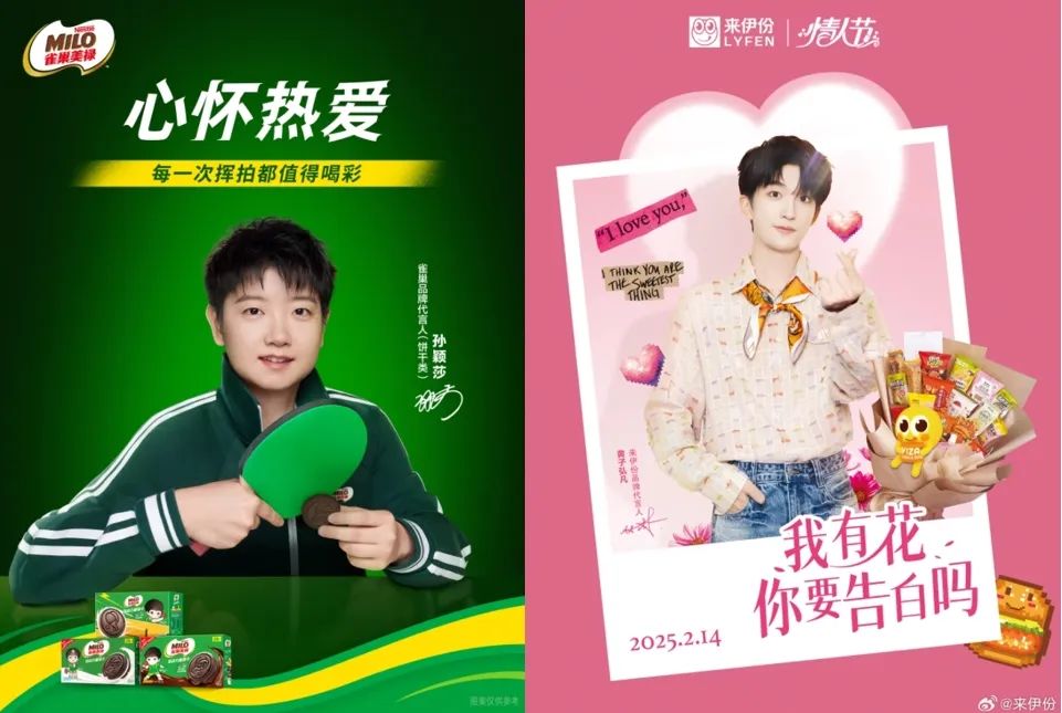 旺旺就长期经营“旺仔”IP,通过衍生表情包、开设社媒账号等形式丰满IP内涵,“旺仔俱乐部”微博、小红书已经分别积累了260万+和120万+粉丝。挑选代言人时,零食品牌更偏爱个性鲜明、在特定年轻圈层中具备号召力的明星。如徐福记邀请孙颖莎担任雀巢品牌(饼干类)代言人,是看重其健康、阳光气质;来伊份签下黄子弘凡担任品牌代言人则是看重其乐观、亲民形象。