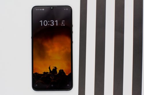 顶部无升降摄像头开口,采用水滴屏设计前置摄像头摆放,正面顶部隐藏式听筒,下部屏下指纹,减少整体开口,使得手机浑然一体。