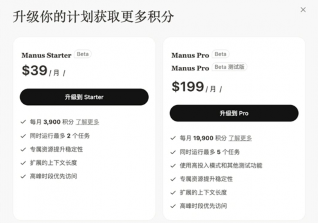 其中,Manus Starter定价每月39美元,每月提供3900积分,最多可同时运行2个任务,具备专属资源和扩展的上下文长度。