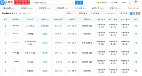 【TechWeb】企查查App显示,近期,荣耀终端有限公司新增多条商标受让信息,转让人为华为技术有限公司,转让数量超700个,商标包括荣耀亲选、荣耀、荣耀名居等,商标国际分类涉科学仪器、家具、服装鞋帽等。