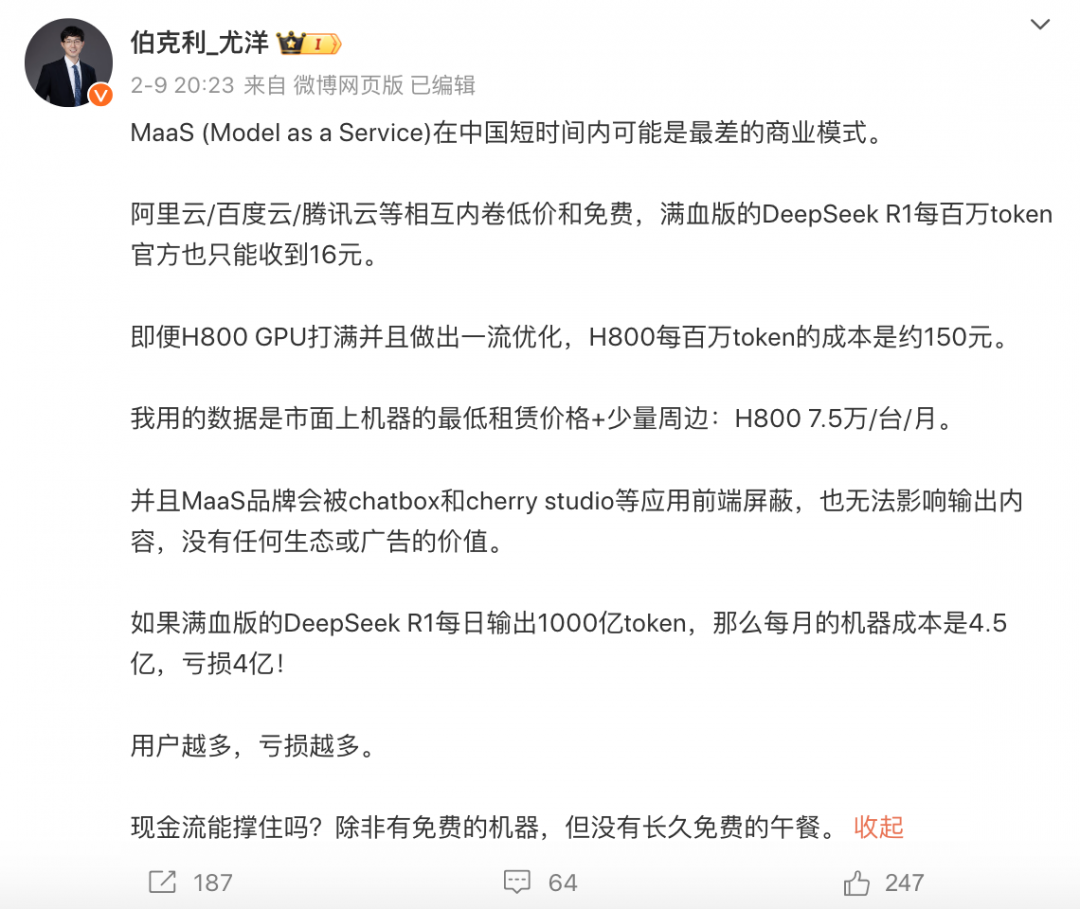 但在2月9日,潞晨科技CEO尤洋发文指出,“MaaS (Model as a Service)在中国短时间内可能是最差的商业模式。阿里云/百度云/腾讯云等相互内卷低价和免费,满血版的DeepSeek R1每百万token官方也只能收到16元……如果满血版的DeepSeek R1每日输出1000亿token,那么每月的机器成本是4.5亿,亏损4亿!用户越多,亏损越多。”