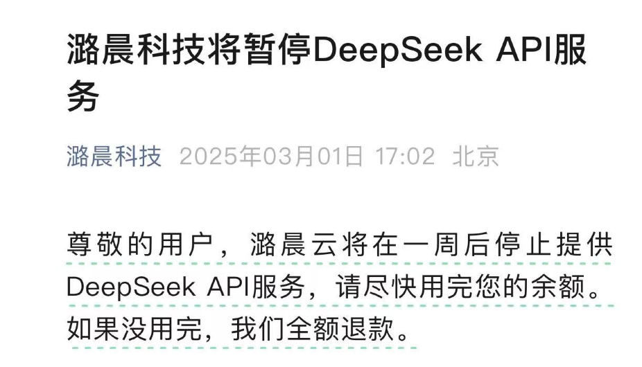 潞晨科技官方公众号发文称,“潞晨云将在一周后停止提供DeepSeek API服务,请尽快用完您的余额。如果没用完,我们全额退款。”
