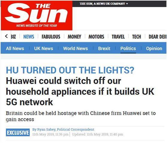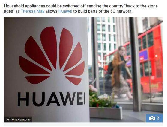《太阳报》声称,梅政府允许华为有限参与英国5G,给英国带来家用电器可能会被中国关掉的风险,让英国“重回石器时代”。