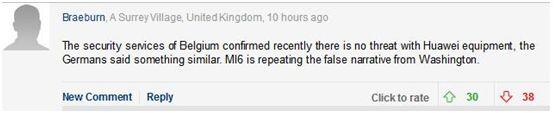 网友Braeburn称,“比利时安全部门最近证实,华为的设备不构成威胁,德国方面也说了类似的话。军情六处还在重复来自华盛顿的错误说法。”