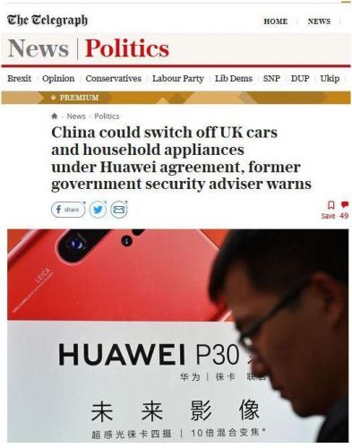 美国国务卿蓬佩奥用撒切尔夫人吓唬英国人别用华为(详见登门逼英国拒华为,蓬佩奥居然敢搬出她)没几天,一份更加吓唬英国人的报告出现在该国报章上。这份报告用危言耸听的论调称,如果特雷莎⋅梅政府继续拥抱华为,连英国人的灯以及家用电器都将被华为“关掉”。