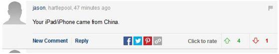 还有人调侃,“你的iPad/iPhone就来自中国”,“现在不都是中国制造吗?”↓