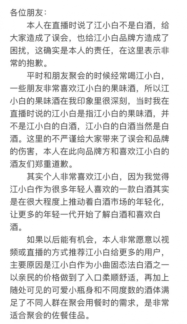 天权在道歉信中称其在直播时说了江小白不是白酒,给大家造成了误会,也给江小白品牌方造成了困扰,表示非常的抱歉。他解释称:当时我在直播时说的江小白是指江小白的果味酒,并不是江小白的白酒,江小白的白酒当然是白酒。
