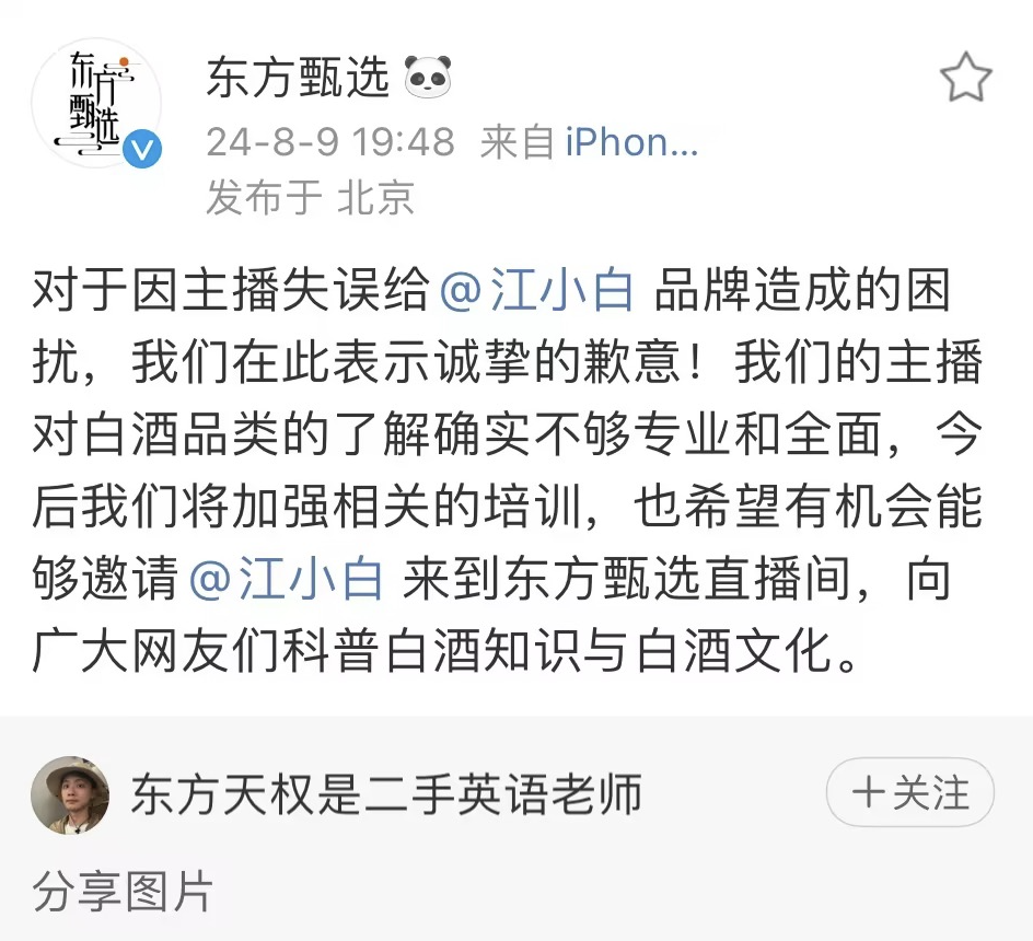 【TechWeb】8月10日消息,东方甄选官方微博发文向江小白表示歉意,同时,东方甄选还带上了主播天权对江小白的道歉信全文。