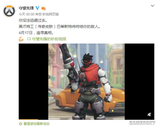 今日凌晨,@守望先锋官微公布了巴蒂斯特 的全新传奇皮肤“黑爪特工”,这款皮肤将于4月17日在游戏中上线。