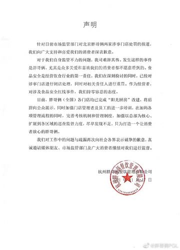 日前,胖哥俩(全国)各门店均已完成“阳光厨房”改建,将后厨向公众展示,同时加强门店管理者及员工的进一业培训,在加码各项管理流程的同时,完善考核机制和管理制度,加强以总部为核心,扩展到各区城的巡查监督力度,尽早发现不足,只为打造一个让消费者放心的胖哥俩。我们对工作中的问题与疏漏再次向社会各界农示诚挚的歉意,真诚邀请媒体朋友、市场监管部门及广大消费者继续对我们进行监督。