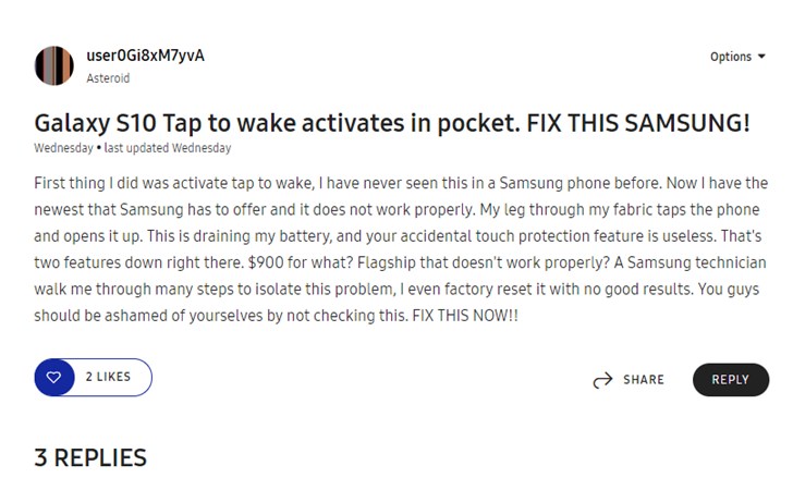 引起这一问题的当然是用户口袋里的S10手机,这一问题似乎是由接近传感器引起的,部分三星S10用户遇到了一个问题。
