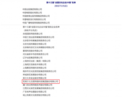 匠心打造数字文化产品 三七互娱入选“全国文化企业30强”提名快报