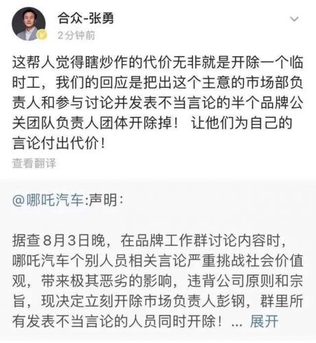 然而紧接着,哪吒汽车在官方微博发布声明称,据查8月3日晚,在品牌工作群讨论内容时,哪吒汽车个别人员相关言论严重挑战社会价值观,带来极其恶劣的影响,违背公司原则和宗旨。