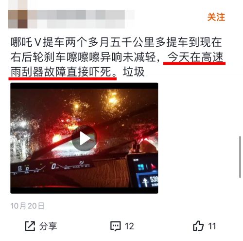 一位在2021年9月提车的哪吒V用户抱怨道,车子时速100公里后时速表就会卡顿;另一位2020款哪吒U用户则遇到刹车抱死、转向失灵的状况,4S店称维修需拆卸中控台;还有位哪吒V用户称自己后悔贪便宜买这台车,开了一个月后方向盘高速时跑偏,权当花钱买了教训。