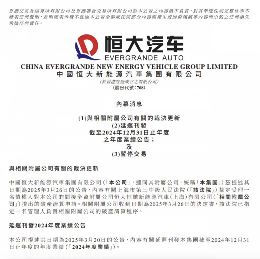 以待公司刊发2024年度业绩公告,恒大汽车在公告中表示,恒大汽车在港交所发布公告称。