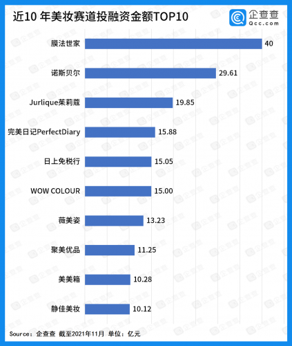 “新贵”国货正改写历史!根据企查查数据研究院发布的《近十年美妆赛道投融资数据报告》,我国现存21万余家美妆企业,近10年美妆赛道共发生融资538起,披露融资额超356亿元,涉及项目品牌311个。其中,“膜法世家”以40亿元摘得魁首,“诺斯贝尔”以29.61亿元位列第二,“Jurlique茱莉蔻”以19.85亿元位列第三。